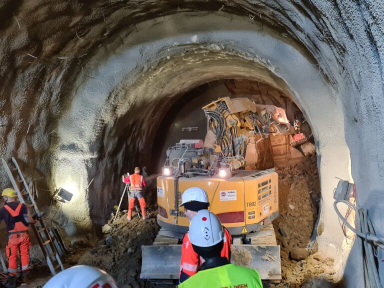Eine Wendeltreppe führte uns anschließend 30m unter die Oberfläche, wo uns dann die beiden Tunnelröhren gezeigt wurden. In einer war die Ortsbrust mit den, mit Spritzbeton fixierten, Stahlgittermatten zu sehen. Wir sahen dabei den Bagger bei den finalen Abgrabungsarbeiten für diesen Arbeitsschritt und das Aufbringen des Spritzbetons.